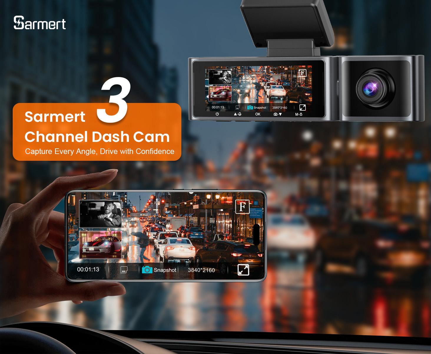 - 4K 3 Channel Dash Cam - Sarmert 2025 Upgraded 5G WiFi & GPS Dash Cam Front and Rear Inside 4K+1080P+1080P, Free 64GB Card, 3.18" Screen,IR Night Vision, 170°Wide Angle, WDR, Parking Mode, G-Sensor