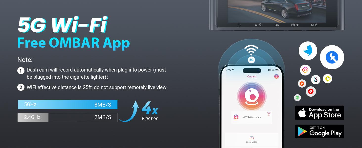 HIGH-SPEED TRANSMISSION: 5G/2.4GHz dual-band WiFi can be switched at will to avoid wireless interference. The transmission time is shortened by 50%, and the WiFi signal range works best within 25 feet. Use the "OMBAR" app to preview, play, download or share videos in real-time on iOS and Android devices.