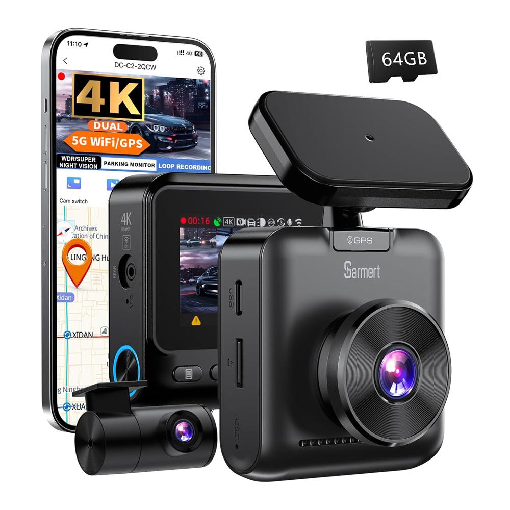 - Sarmert C2 4K Dual Dash Cam Front and Rear- Built-in GPS and 5G WiFi, Free 64GB Card Included, 4K UHD Dash Camera for Cars, Night Vision, WDR, Loop Recording, App Control, 24H Parking Mode